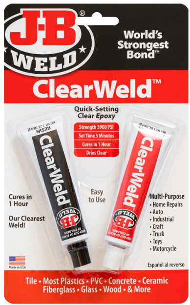 ClearWeld™ is a quick setting, multipurpose two-part epoxy that provides a strong and lasting bond on most surfaces including tile, most plastics, ceramic, glass, wood and metal. ClearWeld™ is designed to cure with a clear, transparent bond when used at thicknesses of less than 15 mil. ClearWeld™ has a 1:1 mixing ratio, sets in 5 minutes and cures in 1 hour. With a tensile strength of 3900 PSI, ClearWeld™ sets to a hard, permanent bond. 28.4 g per tube