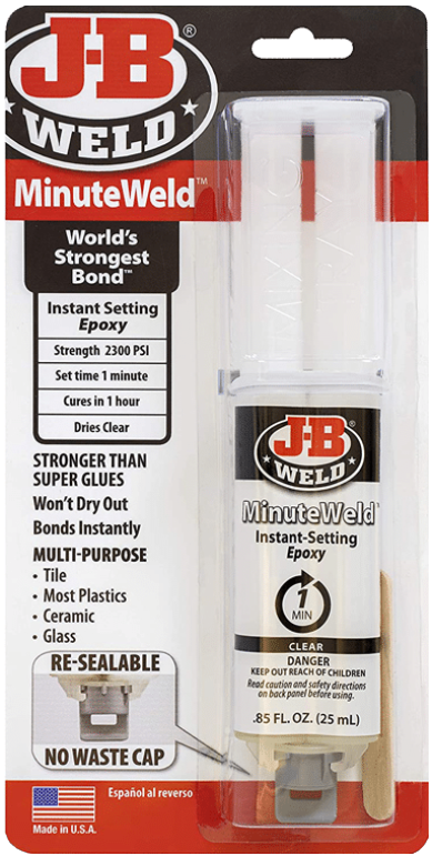 MinuteWeld™ is a special formulated, high-strength, two-part instant setting epoxy. MinuteWeld™ will set under most temperature conditions in one minute. MinuteWeld™ is designed to adhere to multiple surfaces and can be used on ceramic, tile, glass, stone, most plastics, wood and metal. 25 ml