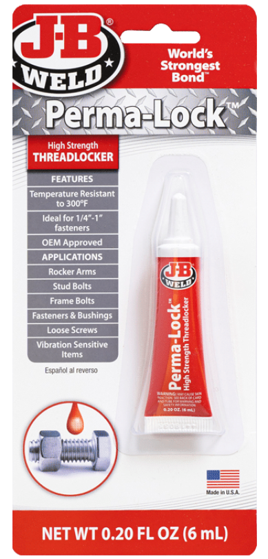 J-B Weld Thread lockers provide a reliable and superior lock and seal for threaded fasteners. Ideal on all mechanical parts, body assemblies, and hundreds of other applications to prevent loosening of fasteners from shock and vibration. J-B Weld Perma-lock High Strength Thread locker is ideal for heavy-duty applications requiring resistance to severe shock and vibrations. Heating and hand tools are required to separate parts. 6 ml