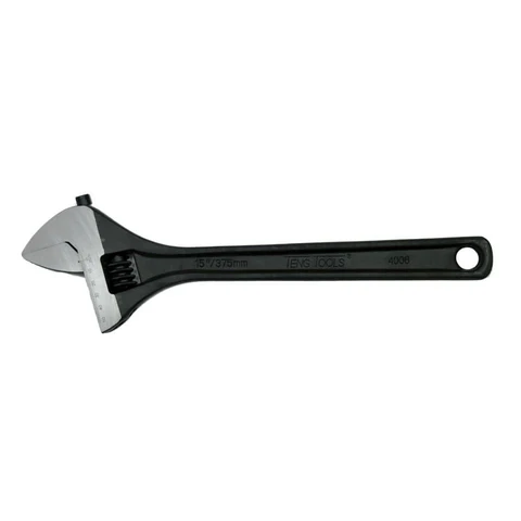 Industrial adjustable wrenches made of chrome vanadium. Exceeding international standards ISO 6787-1982, ASME B.107.8M-1996, BS 6333-1995, DIN 3117-1988, JIS B4604-1976. The 15deg jaw allows the wrench to be used in narrow areas as only 30deg turning is needed. The wider jaw opening increases the range of bolt sizes to be worked on. Non protruding on the movable jaw end gives better action when space is limited. The handle provides a comfortable hand fit. Phosphate finish.